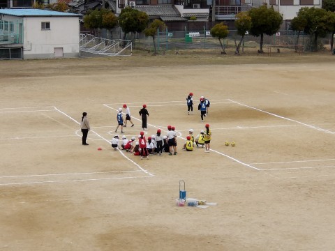 体育はボールけりゲームです。サッカーにつながる動きですね。友達のチームの動きをみながら自分たちの作戦を考えていました。