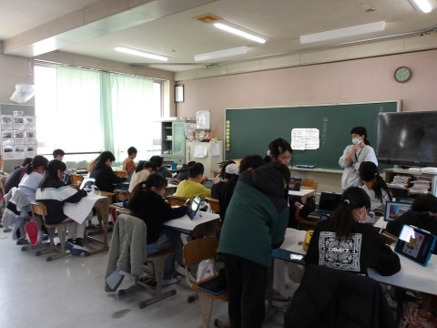 図工は作品バックに絵を描いていました。一年間の思い出などタブレットで調べたことを参考にしながら描いている子もいました。