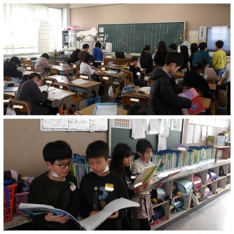 国語は「モチモチの木」の学習です。豆太の気持ちを考え,友達と書いた意見を交流していました。