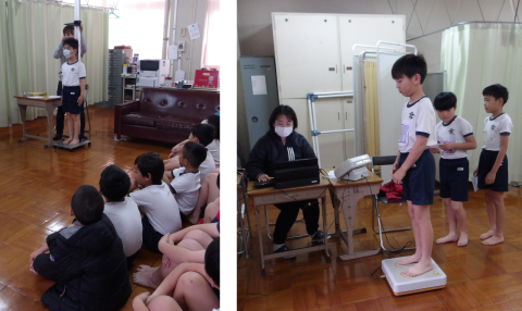 保健室で身体測定。保健の先生から話を聞いたあと身長と体重をはかりました。待っている間,静かに待てました。