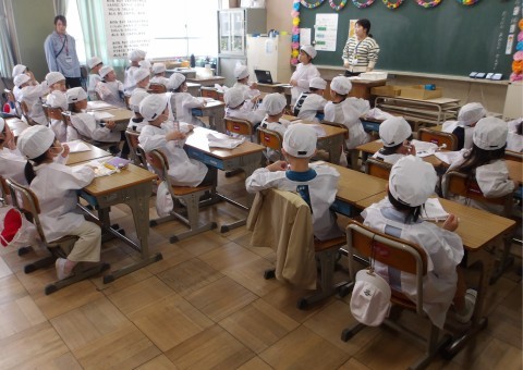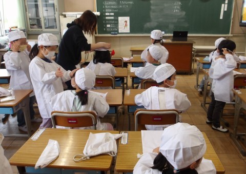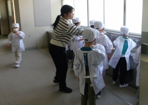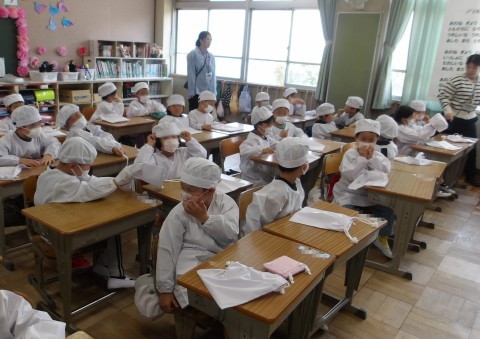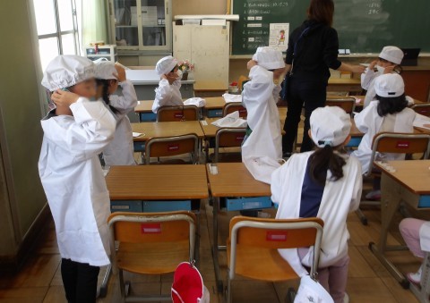 明日から始まる給食のためにエプロン・帽子をつけたり,並んだり,手を洗ったりして練習をしました。