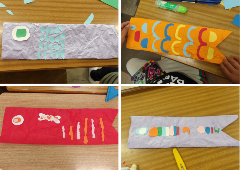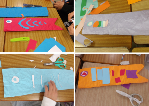 図工では「すごい!アーム鯉!」をテーマにオリジナル鯉のぼりを作っています。