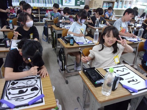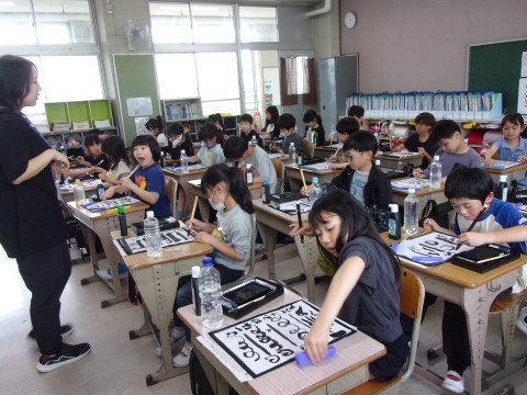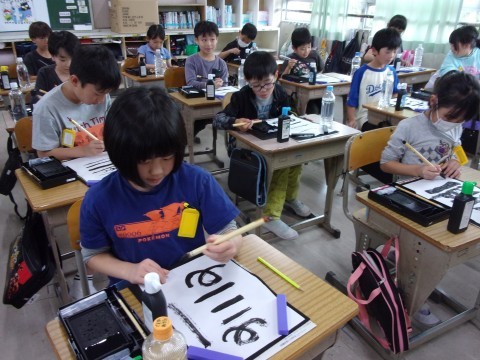 4月20日(月) 書写「はじめての習字」 3年生 公開日 2026/04/20 更新日 2026/04/20 3年 はじめてがいっぱいの3年生。今日は3年2組ではじめての習字の学習をしました。筆の持ち方や、片づけの方法など、説明をよく聞いて、いよいよ筆に墨をつけました。いろいろな線を書く練習をして、力加減を確かめていました。はじめての習字は難しいけれど、とても楽しい時間になったようでした。これからも頑張っていきましょうね! +1