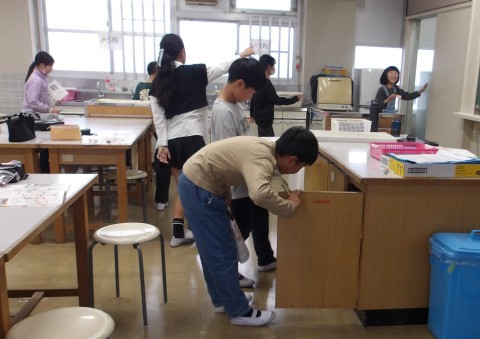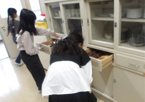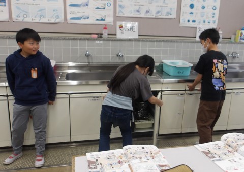家庭科室を探検している様子です。引き出しや戸棚を開けるといろんな道具が見つかりました。おうちで使っている物もあったね。