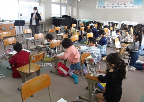 音楽室では、「春のおがわ」の歌から小川をイメージして絵に描いていました。