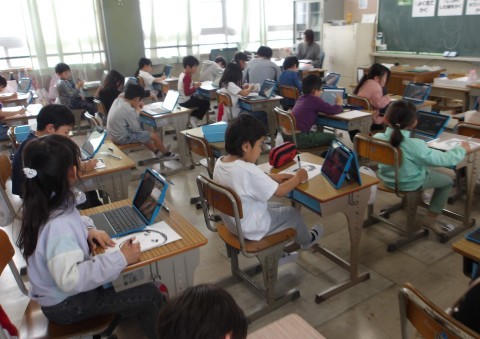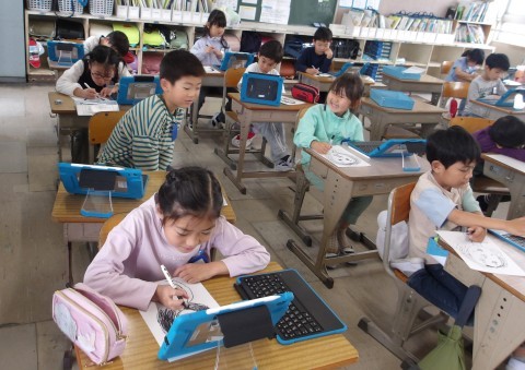 図工ではタブレットに写した写真を見ながら先生の顔を描いていました。