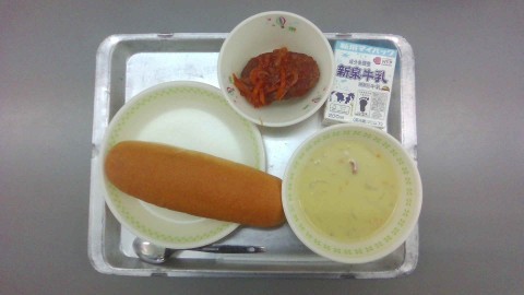 今日の給食は、ぎゅうにゅう、コッペパン、グリーンポタージュ