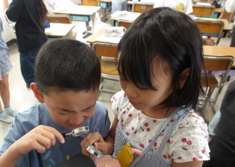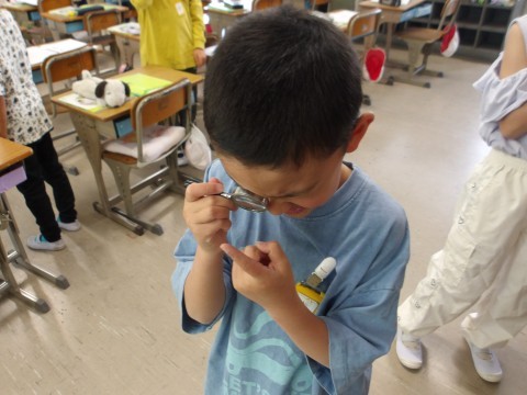 理科では虫眼鏡の使い方について学習しました。虫眼鏡を使って教室内のいろんなものを見ていました。