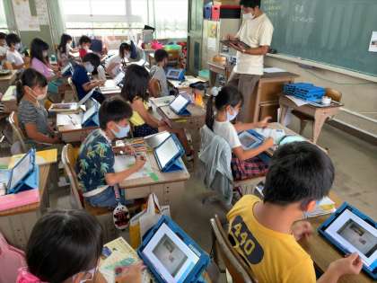 下の写真は、それぞれがもっと詳しく知りたい・興味をもったところ(名所・名物など)をタブレットなどで調べている様子です。