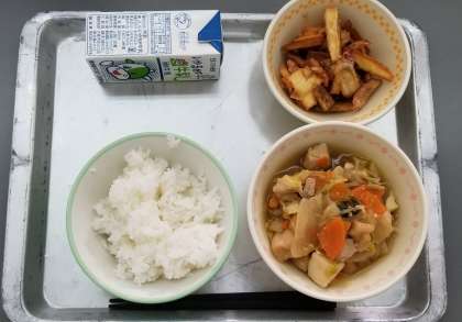 今日の献立は,ごはん,牛乳,とりすき,揚げきんぴらでした。