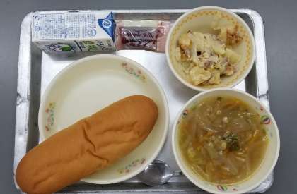 今日の献立は,コッペパン,牛乳,オニオンスープ,じゃがいものグラタン,メープルシロップでした。