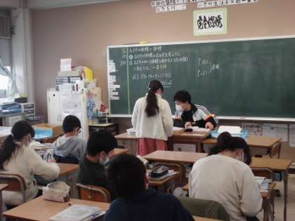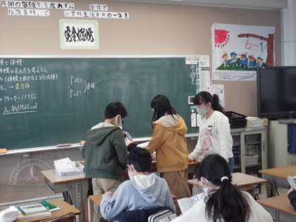 6年1組算数の授業です。体積を求める問題をしていました。先生に採点をしてもらっていました。