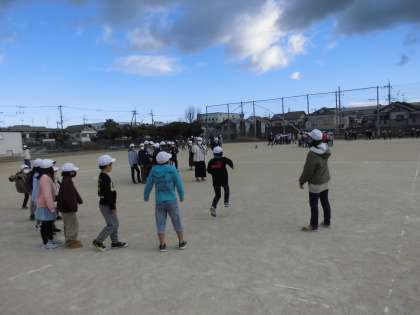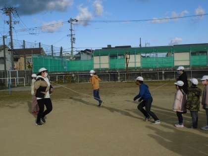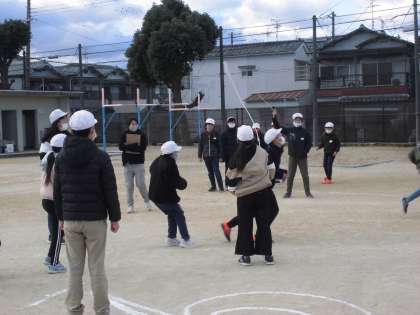 本日(16日)午前8時30分から運動場で、なかよし活動の一環として、全校児童を縦割りで、16班に分け、各班ごとに大なわとびに挑戦しました。とても寒い運動場でしたが、児童の皆さんの元気な声が響いていました。高学年児童が、低学年児童に親切に話しかけている様子をたくさん見ることができました。