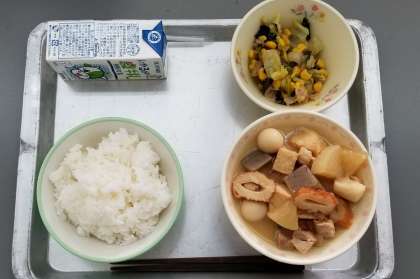 今日の献立は,ごはん,牛乳,みそおでん,小松菜と白菜の炒め煮でした。