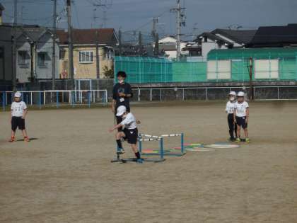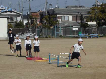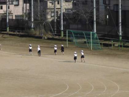 1年3組体育の授業です。運動場はぽかぽかの陽気です。持久走のあと、ハードルを跳ぶ練習をしていました。一生懸命さがすてきです。