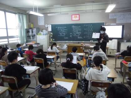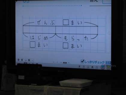 2年1組算数の授業です。大型テレビに大切なヒントが映し出されていました。