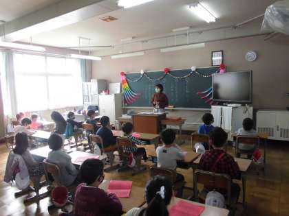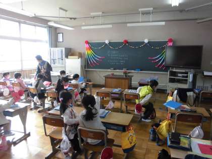 1年生の教室です。登校してからの注意事項が板書されていました。1年生の皆さん、一つ一つ覚えていきましょう。