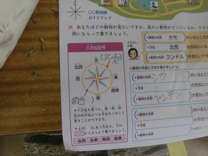 3年2組社会科の授業です。プリントに8方位が掲載されていました。4方位は「東西南北」ですが、8方位は難しいです。きちんとマスターしましょう。