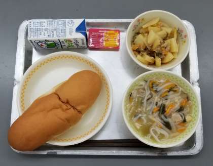 今日の献立は,コッペパン,牛乳,ベトナム風汁麺,ツナピー焼き,いちごジャム&マーガリンでした。