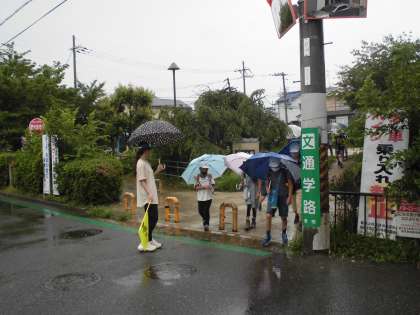 傘をさしての登校になりました。今日は「堺市一斉登校指導」の日でした。通学路で地域や保護者の方に、児童の登校を見守っていただきました。ありがとうございました。今日の下校時間は、3年から1年13時50分、4年14時50分、6年・5年15時45分です。