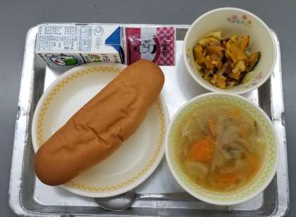 今日の献立は,コッペパン,牛乳,コンソメスープ,かぼちゃのチーズ焼き,大豆クリームでした。