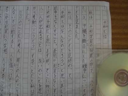 今日、6年生、1年生の代表児童が、平和作文を朗読してくれました。6年生の代表児童の作文には、「平和について、一人一人が出来ることを考えて行動していく(考動)ことが大切」とありました。また、1年生代表児童の作文には、「せんそうは、にどとおこってほしくないとおもいました」とありました。しっかりと自分の考えを書くことができていました。朗読が終わり、ほっとした表情が印象的でした。