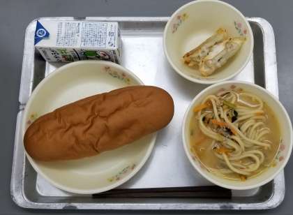 大おかずの「タンタン麺」は,ひき肉の入った辛味のある麺料理です。中国の四川省というところで,材料や鍋を天秤棒で担いで売り回った麺なので「担々麺」と名前がついたようです。堺市でとれた小松菜をたっぷり入れました。給食の人気メニューの一つです。