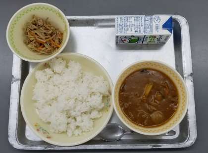 今日の献立は,夏野菜,カレーライス,牛乳,ごぼうサラダでした。