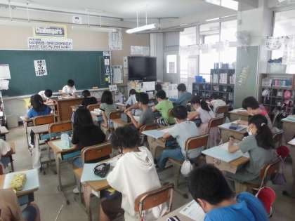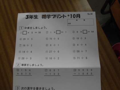 朝の学習タイムです。プリント学習に取り組みます。3年生のプリントです。計算問題や漢字の書き取りは、くりかえし練習するようにしましょう。