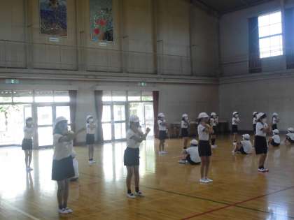 4年生体育参観に向けての練習です。女子のラジオ体操の様子を、男子児童の皆さんがチェックをしていました。さて、ラジオ体操を上手にできましたか。