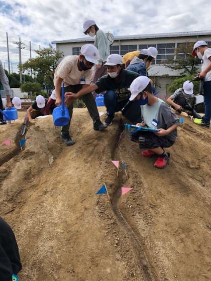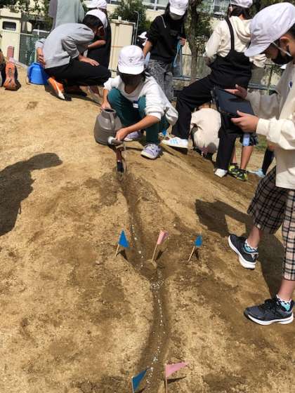 今日は川の流れの特徴を調べる実験をしました。中庭の築山に川のように曲がった筋を作り,水を流しました。外側が削れていることに気が付いた人もいて,友だちと話し合いながら実験をしていました。