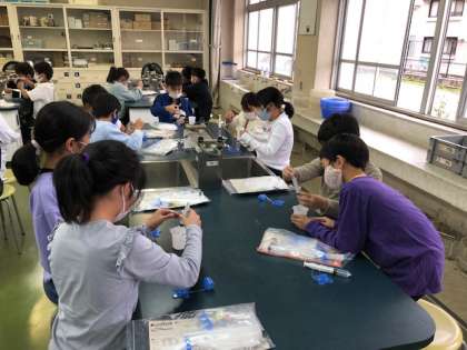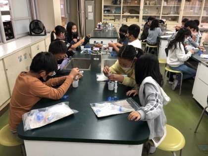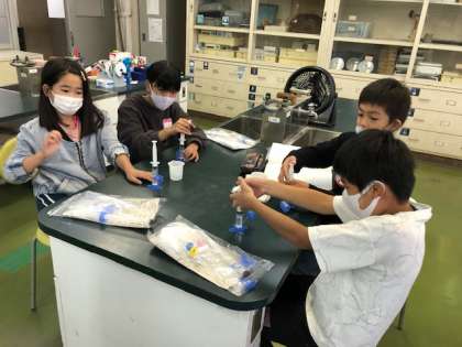 4年1組のみんなも空気と水の実験をしました。空気は集めて押すと押し縮めることができるのに,水はまったく縮めることができなくてびっくり!