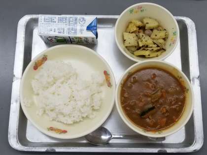 今日の献立は,パンプキンカレーライス,牛乳,じゃがいものバジル焼きでした。