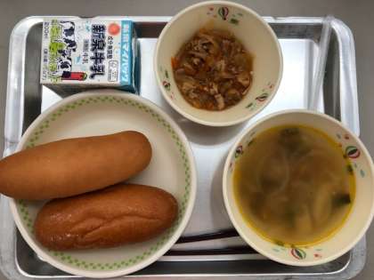 今日の献立は,ミニパン,あげパン,肉団子スープ,豚肉の甘酢煮,牛乳でした。