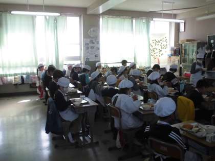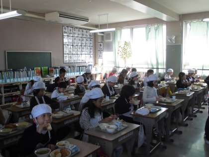 4年生の教室です。配膳が終わり、給食が始まりました。感謝の気持ちでいただきましょう。