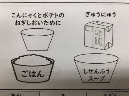 今日の献立は,ごはん,四川風スープ,こんにゃくとポテトのねぎ塩炒め煮,牛乳でした。