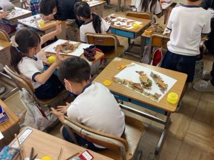 下が1年生の図工の様子です。秋みつけで拾った落ち葉などを使って絵をかいています。