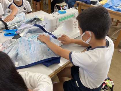 下の写真は,5年生の家庭科の様子です。ミシンを使ってエプロンを製作しています。