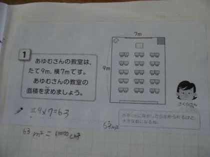4年2組算数科の授業です。「7m×9mの教室」の面積を求める計算をしていました。単位が「平方メートル」ではなく、「平方センチメートル」の場合の数値は何になるかを考えていました。