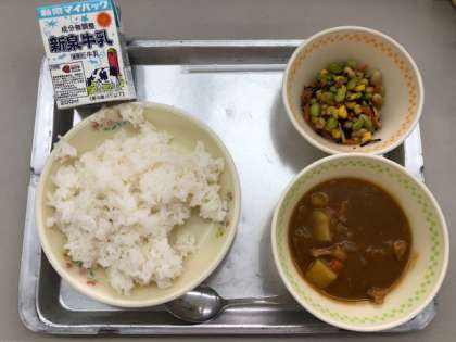 今日の給食は、ごはん、カレーライス、大豆とひじきのサラダ、牛乳でした。