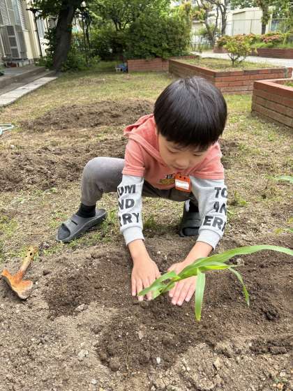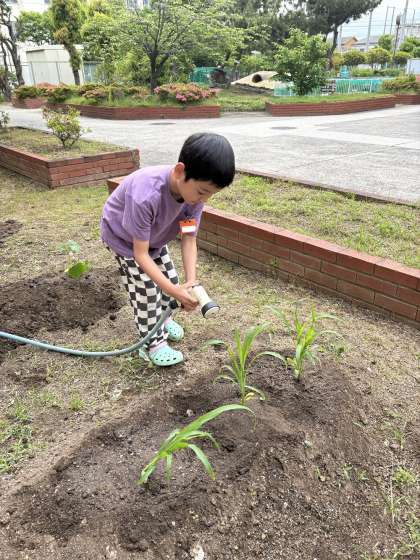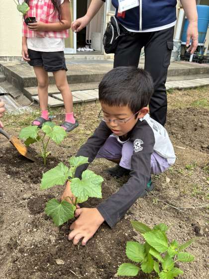 ミニトマト、トウモロコシ、きゅうり、大葉を植えました。