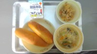 今日の給食は、コッペパン、ぎゅうにゅう、
