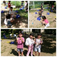 体育は自分たちで考えて障害物を置き、リズムよく跳び越える運動をしています。班で相...