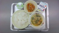 今日の給食は、ぎゅうにゅう、ごはん、カレーどうふ、もやしとちんげんさいのサラダで...