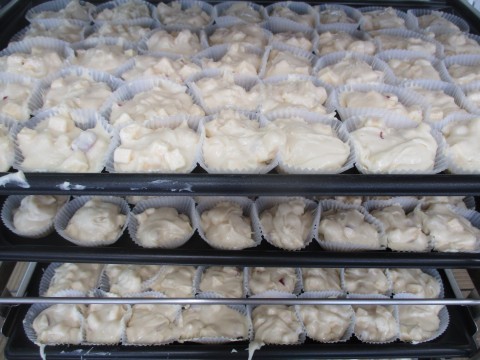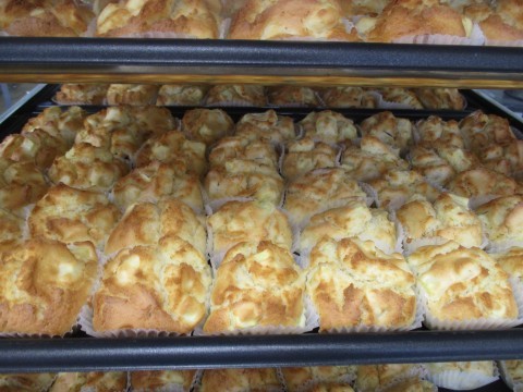 調理員さん達がひとつひとつ丁寧に生地をカップに流し入れてくれました。オーブンでこんがり焼くと,甘くてとてもいい匂いがしました。