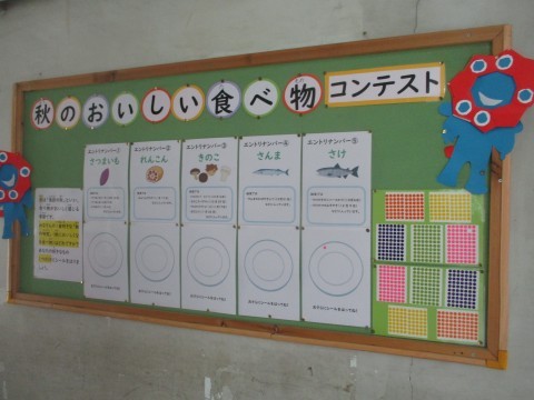 給食場前の掲示板では,今日から「秋のおいしい食べ物コンテスト」が開催されています!