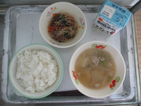 10月16日(木)今日の給食 公開日 2025/10/16 更新日 2025/10/16 給食・食育 今日の献立は・ごはん・牛乳・タッカンマリ風スープ・チャプチェでした。「タッカンマリ」とは,韓国語で「鶏一羽」という意味です。一羽丸ごとの鶏肉と,じゃがいもなどの野菜を煮込んだ鍋料理です。今日は韓国のおもち「トック」も入っていて,ボリュームも栄養もたっぷりです。