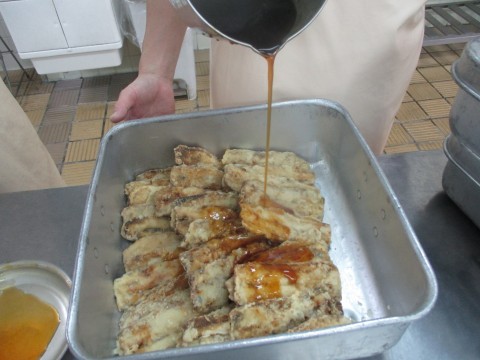 食べやすいように油で揚げて、甘辛いタレをかけました。
