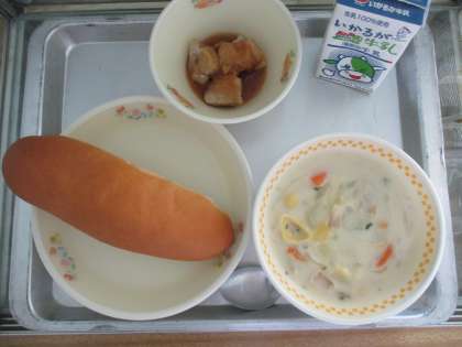 3月8日(火) 今日の給食 公開日 2022/03/09 更新日 2022/03/09 給食・食育 今日の献立は ・コッペパン ・牛乳 ・クリームスープ ・鶏肉のバーベキューソース でした。 「鶏肉のバーベキューソース」は、6年生のリクエスト献立「肉料理」の1位になった料理です。にんにくやりんごピューレなどを使ったソースが鶏肉によく合います。
