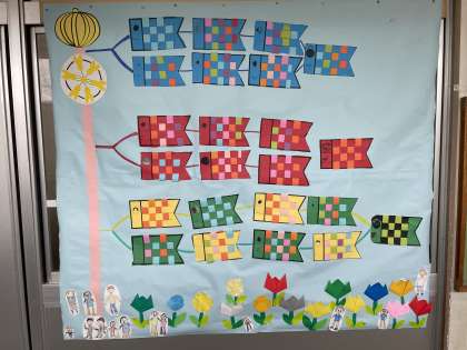 今回は図工の時間に,色画用紙を交互に編んで鯉のぼりを作りました。